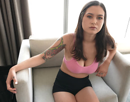 Jasmine has been trying to grow her yoga video channel but hasn’t had much luck. When her male roommate suggests she be a little more sexy, she decides to give it a try modeling a tight sports bra and cheeky panties for him. He tells her he loves the combination of yoga and ass and is surprised when she says she would fuck her first official fan. That is when he confesses he watches her videos and thinks they are hot. Walking over to him, the fit, busty babe pulls his dick out and proceeds to give him a great blowjob. She stands, drops her panties, then backs that ass up onto his hard cock, bouncing and riding him. Moving to the bed, he hits it doggy style then lays her on her back and buries the bone in her shaved pussy fucking her until she cums then pulling out and shooting his wad all over her pussy. This video channel is going to be very popular!
